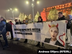 Și vineri manifestanții au purtat cu ei pancarte cu mesaje care au făcut trimitere la un episod din timpul conferinței de presă de joi. Conferința a fost organizată de conducerea Curții de Apel București pentru a opri tăvălugul declanșat de magistrații care au dezvăluit neregulile din sistem.