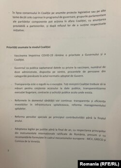 De asemenea, Coaliția, premierul și membrii guvernului „își asumă să nu adopte poziții publice prin care să submineze activitatea și agenda guvernamentală și a membrilor guvernului. Comunicarea publică se va face în spirit de susținere reciprocă și solidaritate".