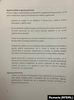 „Performanța ministerială este evaluată periodic având ca reper programul de guvernare votat de Parlament și deciziile de parcurs, ulterioare, ale Coaliției de guvernare, iar performanța guvernului va fi evaluată periodic în cadrul Coaliției de guvernare", se arată în completarea acordului de guvernare.