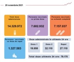 Astfel: 19.950 de persoane au fost vaccinate cu doza I, 32.110 cu doza a II-a și 27.110 cu doza de rapel. Din 27 decembrie, 2020, când a început vaccinarea anti-Covid, au fost administrate peste 14 milioane de doze, 7.602.932 fiind vaccinate cu prima doză, 7.157.037 cu a doua și 1.327.583 cu doza de rapel.