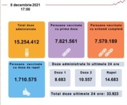 Potrivit datelor puse la dispoziția Comitetului Național de Coordonare a Activităților privind Vaccinarea împotriva COVID-19 (CNCAV) de către Institutul Național de Sănătate Publică, situația vaccinărilor din 8 decembrie 2021 este următoarea: