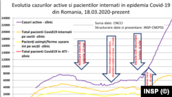 Numărul total de pacienți Covid 19 internați pe secții a oscilat între 3000 și 5000 începand cu 10 aprilie și până pe 15 iulie, crescând la peste 6000 după 25 iulie - la data de 8.08.2020 s-au înregistrat 7147 pacienți Covid-19 internați pe secții.