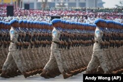 Președintele Chinei, Xi Jinping, îmbrăcat într-un costum tradițional chinezesc gri-închis, a salutat trupele dintr-o limuzină decapotabilă.