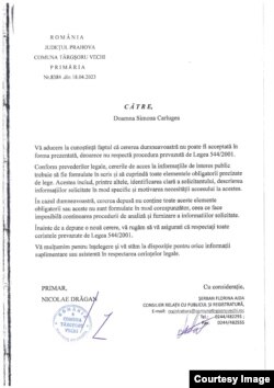 Primăria Târgșoru Vechi nu a răspuns solicitării de informații trimise de Europa Liberă pentru că nu a avut forma dorită de administrația locală. Atașat refuzului am primit și un formular de cerere pentru a reface solicitarea.