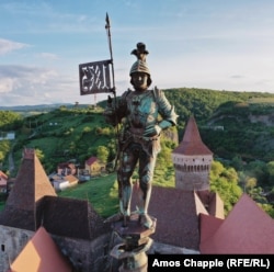 Un cavaler pe una din turlele Castelului Corvinilor.