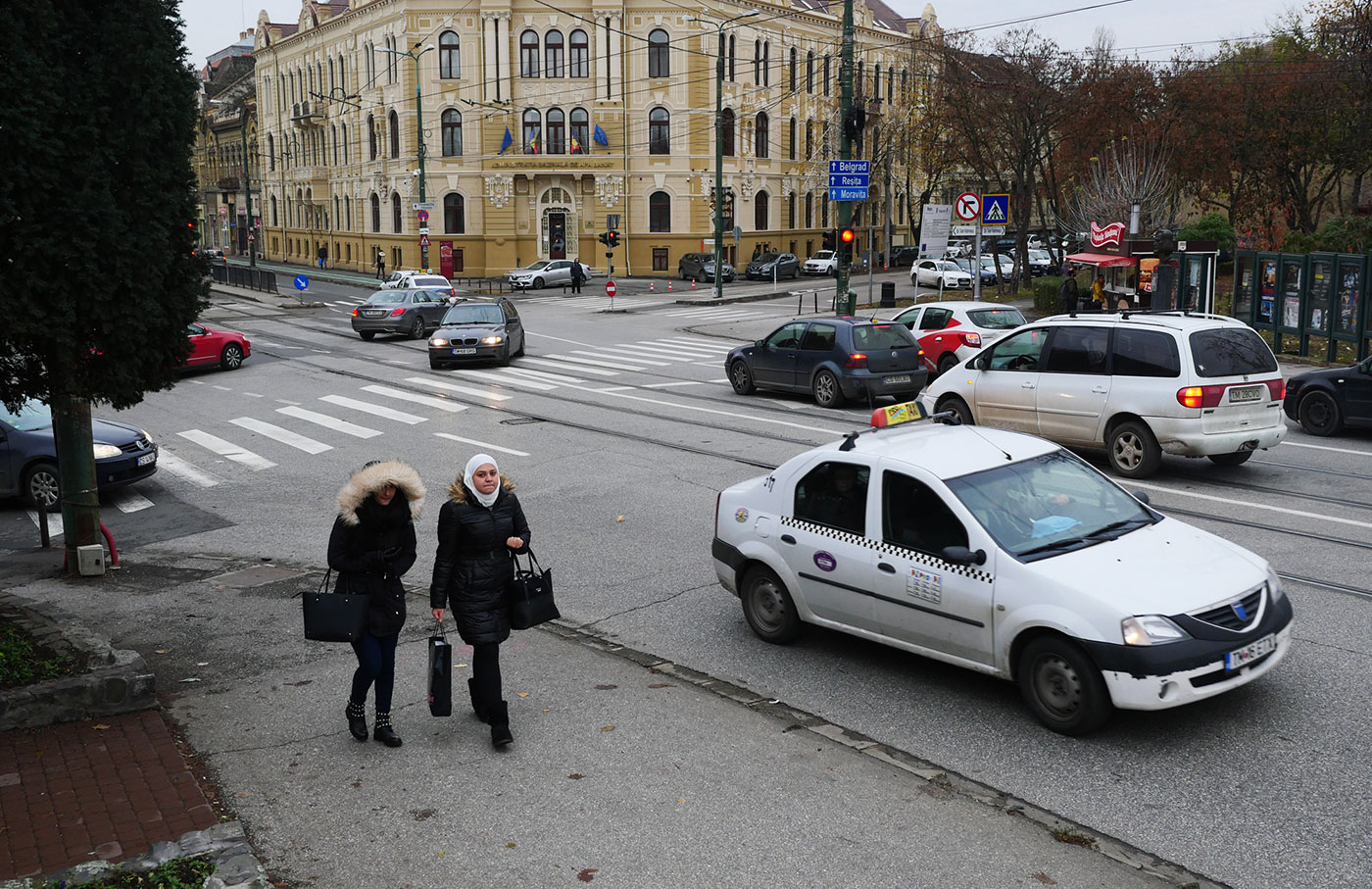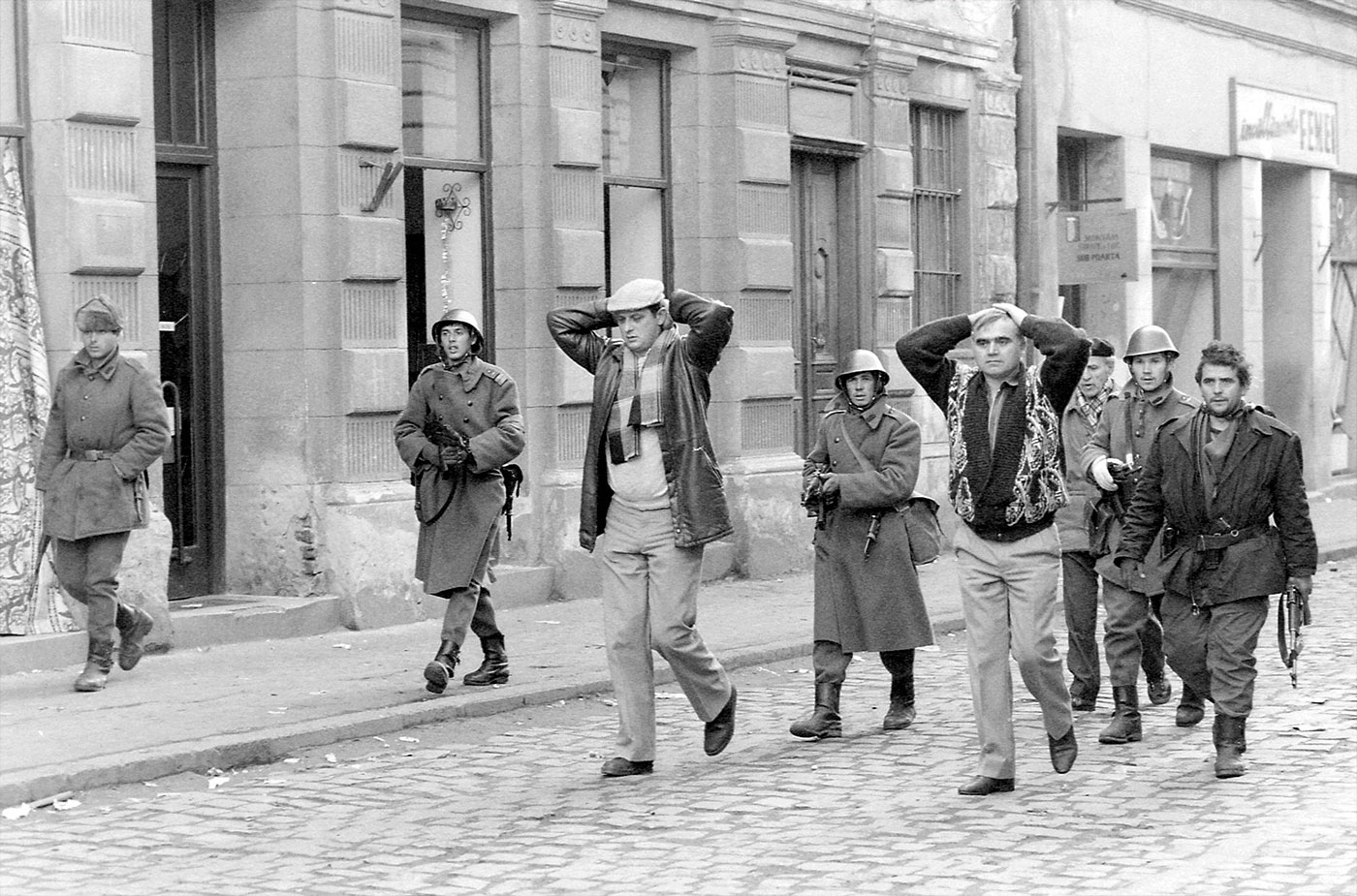 Doi bărbați se deplasează sub amenințarea armei, după ce mașina lor a fost oprită de soldați în Timișoara.Fortepan