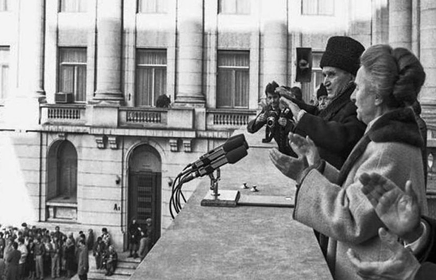 Nicolae și Elena Ceaușescu se adresează mulțimii pe 21 decembrie. Această adresare urma să fie ultima lor apariție publică. FortepanFortepan