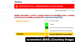 În ultima sa actualizare, Ministerul Român al Afacerilor Externe (MAE) semnalează luni, 13 noiembrie, Tanzania cu factor de risc și recomandarea evitării călătoriilor neesențiale, din cauza Covid și a instabilității politice, cu posibilitatea organizării de manifestații sporadice în Zanzibar și a producerii unor atentate teroriste.