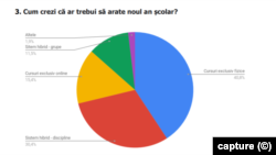 Un procent mai mic, de 15,5% declară că își doresc reluarea cursurilor în sistem exclusiv online, iar restul a declarat că preferă reluarea cursurilor în sistem hibrid - fizic și online, prin împărțirea clasei în grupe, astfel încât să se păstreze distanțarea socială.