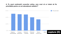 Peste jumătate (50,7%) dintre respondenții chestionarului consideră că, în cazul continuării învățării online, este necesară adaptarea curriculei naționale, astfel încât orele virtuale să pună accentul pe asimilarea conținuturilor de bază din materie. Totodată, 49,6% dintre elevi afirmă că este necesară formarea cadrelor didactice în contextul asimilării competențelor digitale pentru educația online. Peste 40% dintre respondenți susțin că este nevoie de o platformă unică de învățare online la nivel național, pe care să poată regăsi și materialele didactice de la clasă, iar 34% dintre elevi cred că prioritatea principală pentru ca învățarea online să fie calitativă este dotarea cu dispozitive conectate la o rețea de Internet.