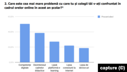 Cea mai mare problemă cu care elevii (50,4%) s-au confruntat în perioada orelor online este lipsa competențelor digitale în rândul cadrelor didactice, dar și dezinteresul acestora privind predarea online, arată un raport făcut de Consiliul Național al Elevilor, privind debutul anul școlar 2020-2021, făcut din perspectiva elevilor, prin cosultarea a 13.000 de respondenți.