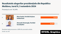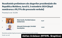 Astfel, Sandu are 55,37% din voturi după prelucrarea voturilor din 99,77% din secțiile de votare, în timp ce Stoianoglo are 44,63% din voturi.