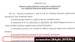 Totodată, aeronavele cu pilot la bord care utilizează neautorizat spațiul aerian național vor putea fi „nimicite” de aeronavele care le interceptează și de „mijloacele de apărare aeriană cu baza la suprafață”.