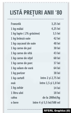 Ce se putea cumpăra cu acești bani? Decretul 42 din 1982 stabilea următoarele prețuri la alimentele de bază. Unele prețuri rivalizează cu cele din ziua de azi. Majoritatea alimentelor din această listă erau însă de negăsit în magazine.