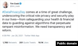Într-un mesaj postat pe Twitter la începutul acestui an, președintele Apple, Tim Cook, susține că datele personale trebuie protejate mult mai eficient decât până acum și că este nevoie de „transparență și reformă”.