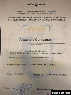 Examinarea începe cu diploma de Doctor Honoris Causa de la Vernadsky Taurida National University din Ucraina, datată 7.10.2019.