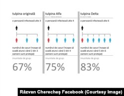 Această variantă, numită „Delta” de Organizația Mondială a Sănătății (OMS), spune profesorul Razvan Cherecheș, infectează un număr dublu de persoane față de tulpina clasică, motiv pentru care procentul de populație imunizată ar trebui să crească de la 70% la 80% pentru a putea reveni la o viață normală, dar mai ales pentru a preveni un posibil val patru.