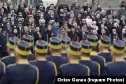 Înainte de începerea paradei, președintele Klaus Iohannis. îmbrăcat în negru și cu o cocardă în culorile naționale la piept, a depus o coroană de flori la Arcul de Triumf.