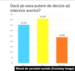 Avortul este considerat o crimă de 50% dintre repondenți, dar sunt mai puțini cei care l-ar interzice 35,2%. La polul opus 32,8% spun că nu e o crimă, dar se opun interzicerii lui 41%. Este mare procentul care spun că nu știu 23,8%.