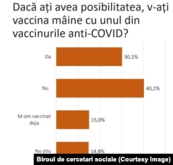 Vaccinarea este dorită în mod ferm de 30,1% dintre repondenți, 15% spun că deja s-au vaccinat, dar este respinsă la fel de ferm de 40%. Astfel, diferența dintre cei vacciniști și opozanții vaccinării este de numai 5 procente.