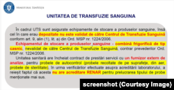 Spitalul deține produse de transfuzie, dar produsele de sânge sunt depozitate impropriu, fără respectarea legislației în vigoare, într-un frigider de uz casnic.