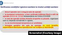 Nici sala de operații nu respectă normativul în vigoare, a arătat controlul care a verificat inclusiv condițiile igienico sanitare pe lângă cele legate de spațiu în cazul blocului operator.