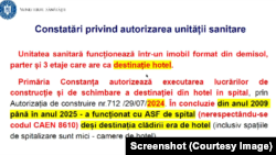 Autorizația sanitară de funcționare pentru spitalul privat Isis Medical Center SRL s-a acordat în contradicție totală cu realitatea din teren, „în sensul în care secția ATI nu respectă toate normele legale de funcționare, respectiv prevederile OMS nr. 914/2006 pentru aprobarea normelor privind condițiile pe care trebuie să le îndeplinească un spital, cu modificările și completările ulterioare”, se spune în raport.