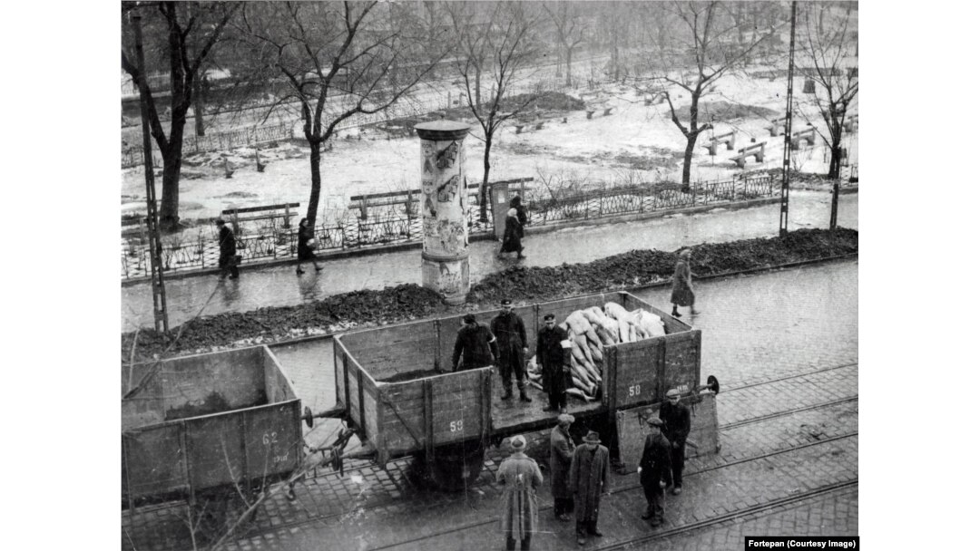 Trupuri transportate din ghetoul Budapestei, locul în care au fost ținuți evreii din Budapesta în iarna 1944-1945, în perioada în care era la putere Partidul Crucilor cu Săgeți.